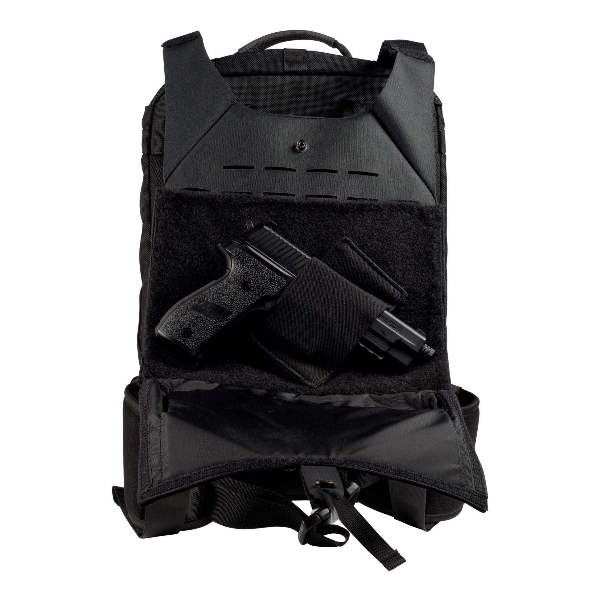 The PCB FRONT CARRIER HOLSTER was designed to attached by Molle to the front of the armored chest carrier for rapid draw of firearm on target after front armor is deployed. This allows the operator to go from basic backpack position to full armor protection and firearm on target within seconds. Nothing compares to this capability.